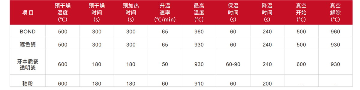 以上操作參數對使用者只是參考,如果燒結后的修復體表面特征,透性及光亮程度與理想狀態不一致,必須調整相應的燒結程序。燒結程序的決定因素不是烤瓷爐的顯示溫度,而是燒結對象燒結后的外觀及表面特性。